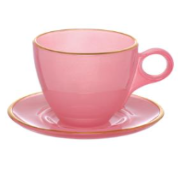 JOGO 04 XICARA+PIRES VIDRO 170ML ROSA BORDA OURO